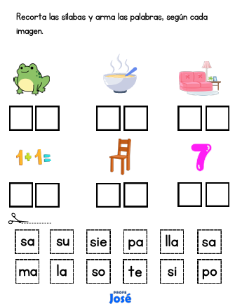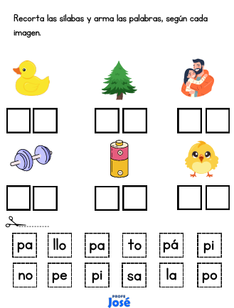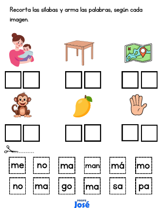 Cuadernillo de actividades donde los estudiantes recortan sílabas y forman palabras según la imagen. Este material ayuda a desarrollar la conciencia silábica, la lectura y la formación de palabras de manera manipulativa y divertida.